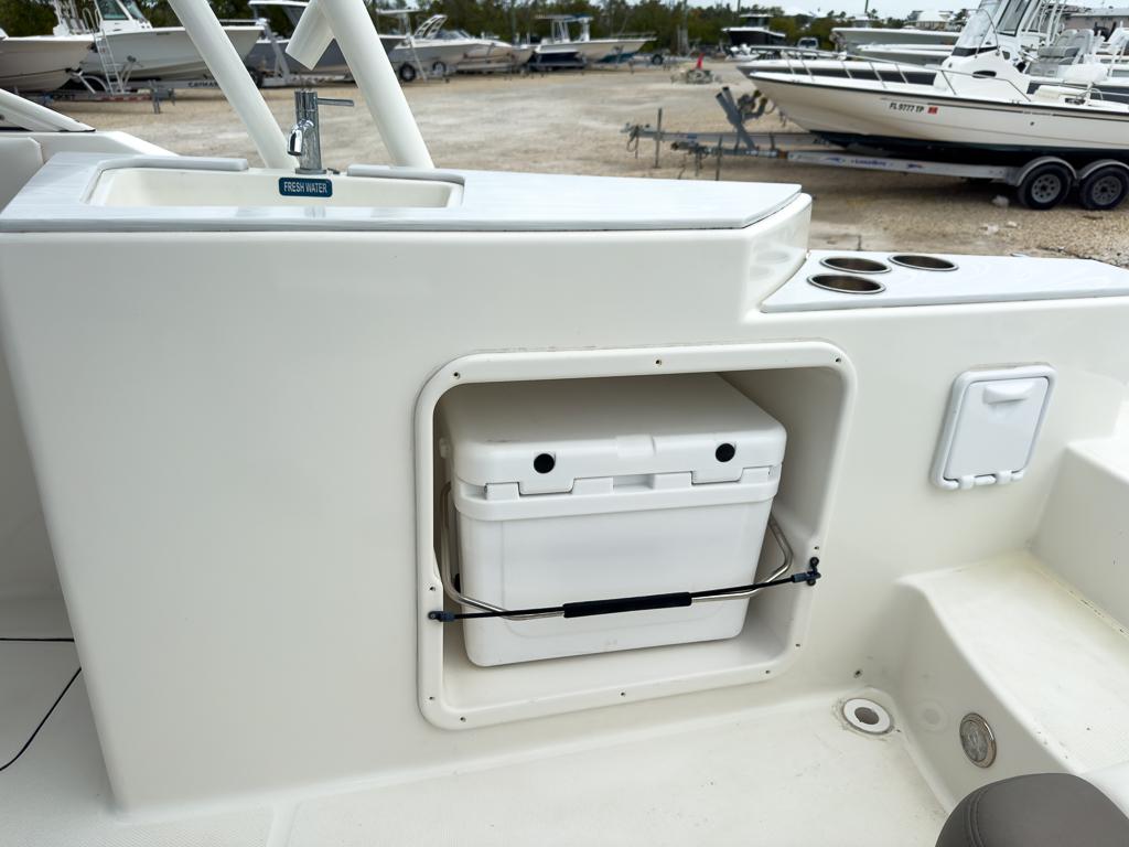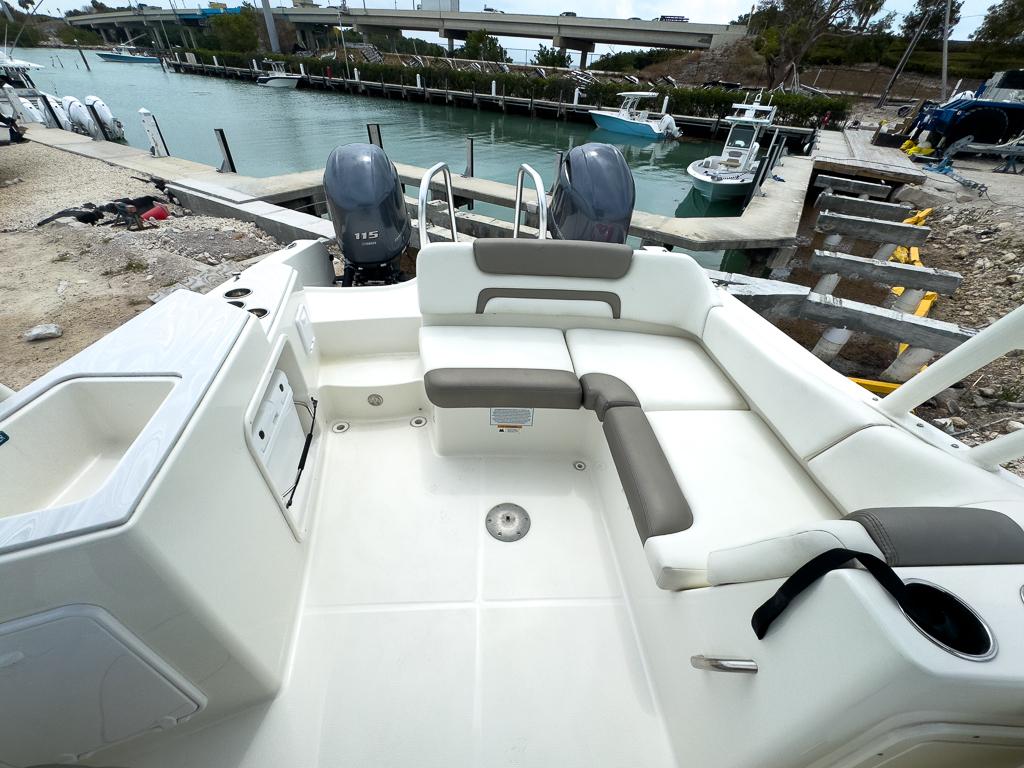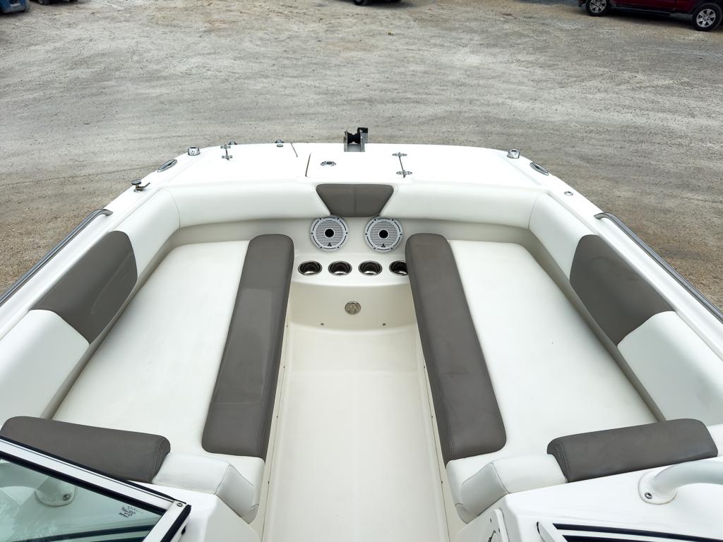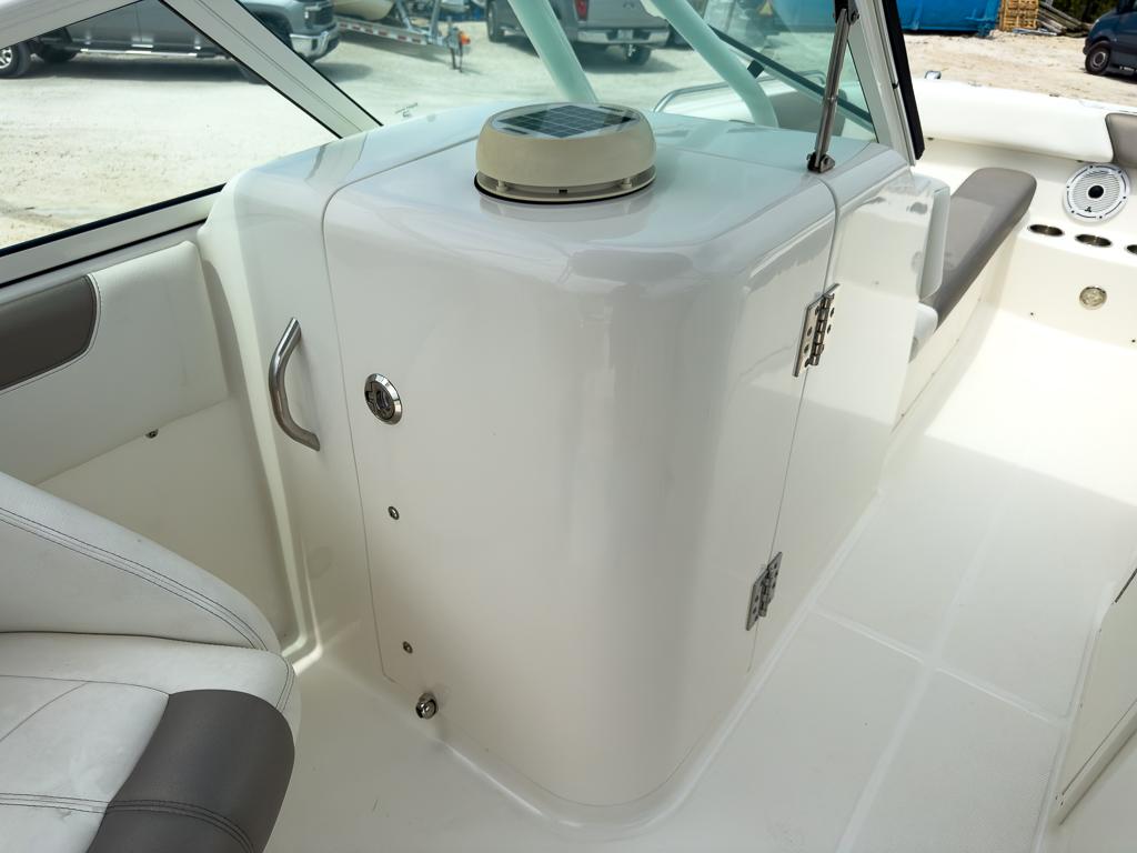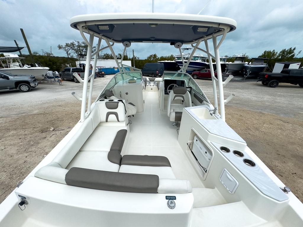 Starboard entertainment center with Corian counter, sink and area for optional 48-quart cooler Entertainment package with 20-gal fresh water system, sink, and marine head Wraparound aft seats with removable cushions and storage Courtesy LED lighting Marine grade switch panel with waterproof rocker switches Below-deck rigging tubes for electronics and additional batteries Offset walk-through transom User-friendly On-Ramp™ swim ladder and swim platform Raw Water Washdown