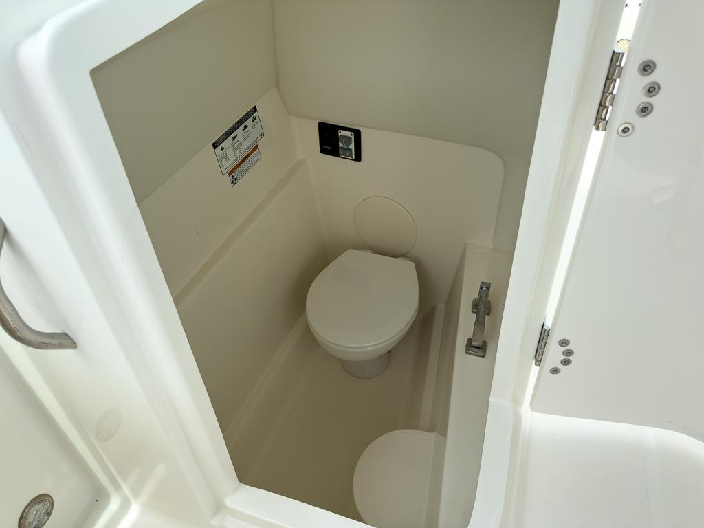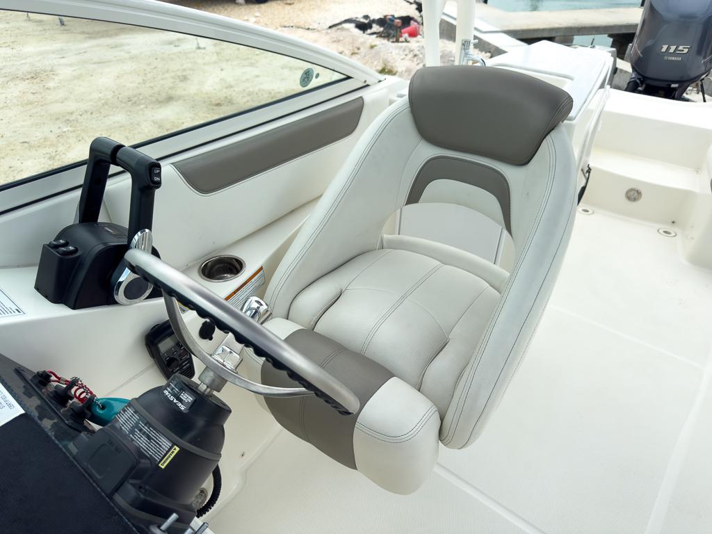 Tilt-helm steering 3-piece walk-through windshield Helm and passenger swivel chairs with flip-up bolster starboard Portside console door with full-sized head compartment Marine head and holding tank Electronics mounting area for a 12-inch screen Fusion® True-Marine™ MS-RA205 Marine Stereo with 4 JL Audio speakers and Bluetooth Dual ram hydraulic steering with tilt-helm and sport wheel Single Garmin GPSMAP 8610xsv 10″ multi-touch widescreen Chartplotter / Sonar Combo, Airmar B150M transducer, dark-tinted acrylic dash, & 315 VHF with 8′ antenna Hull
