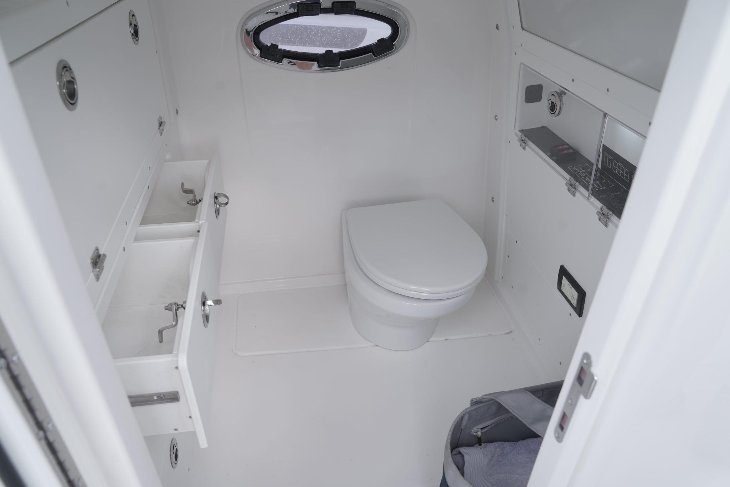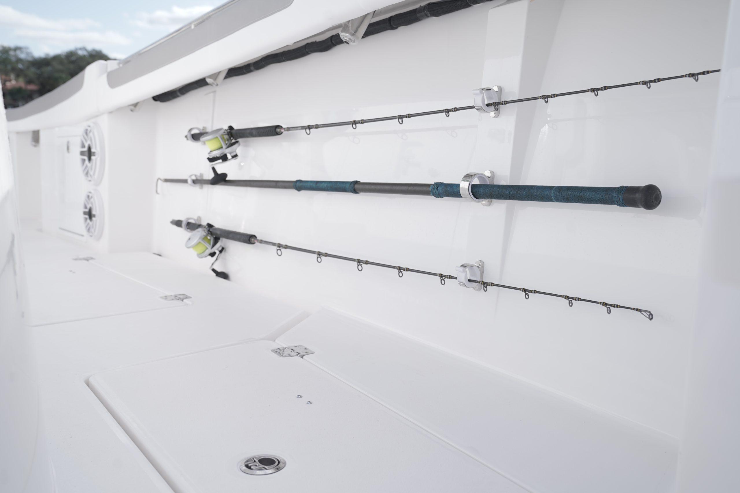 The 34 CT does not have boundaries and is ready to take anything Mother Nature throws its way. With the double stepped, semi-asymmetric hulls and plenty of bow flair, you can fish in comfort through water you’d never brave with another center console in its class. The 34 CT contains six insulated plumbed storage boxes, totaling 3,000 qt of storage connected to macerator pumps. With two storage compartments forward, two mid-ship, and two in the cockpit floor, you can choose where you want to utilize the space for storage versus fishboxes. A 70 gallon transom livewell is standard, with options to add two 25 gallon live wells alongside, as well as plumbing the two after insulated storage boxes as livewells, for a total of 5 bait tanks all fed by a Hooker sea chest and Hooker electric pumps.