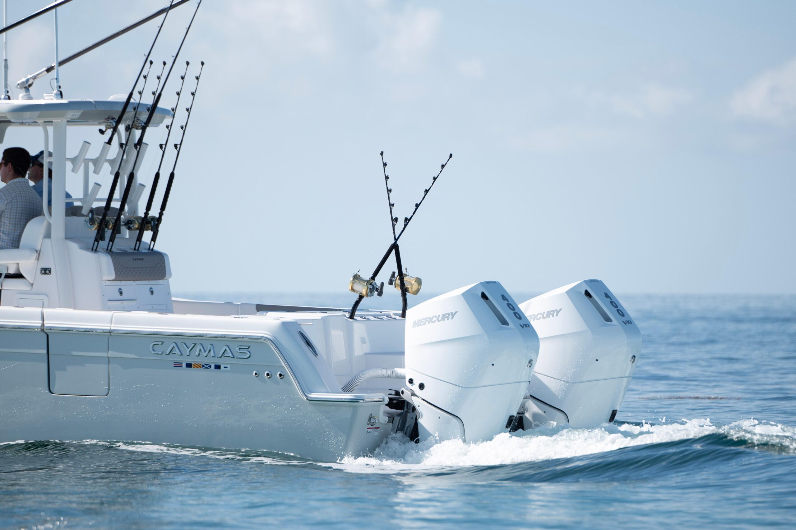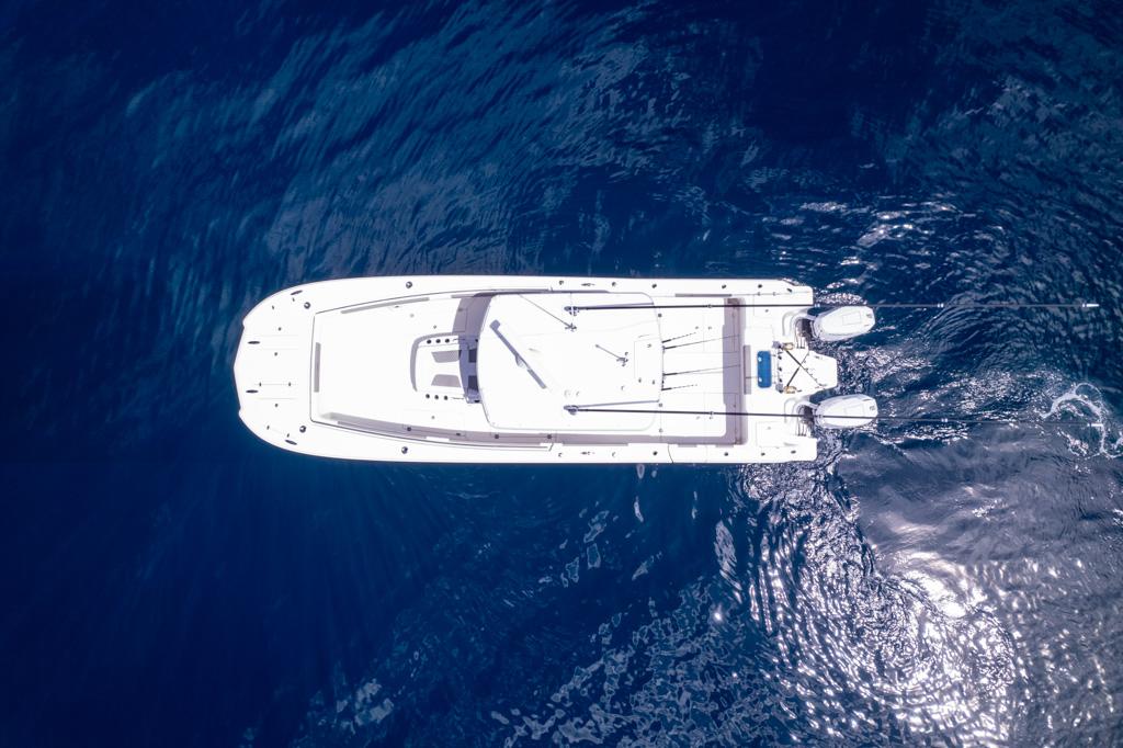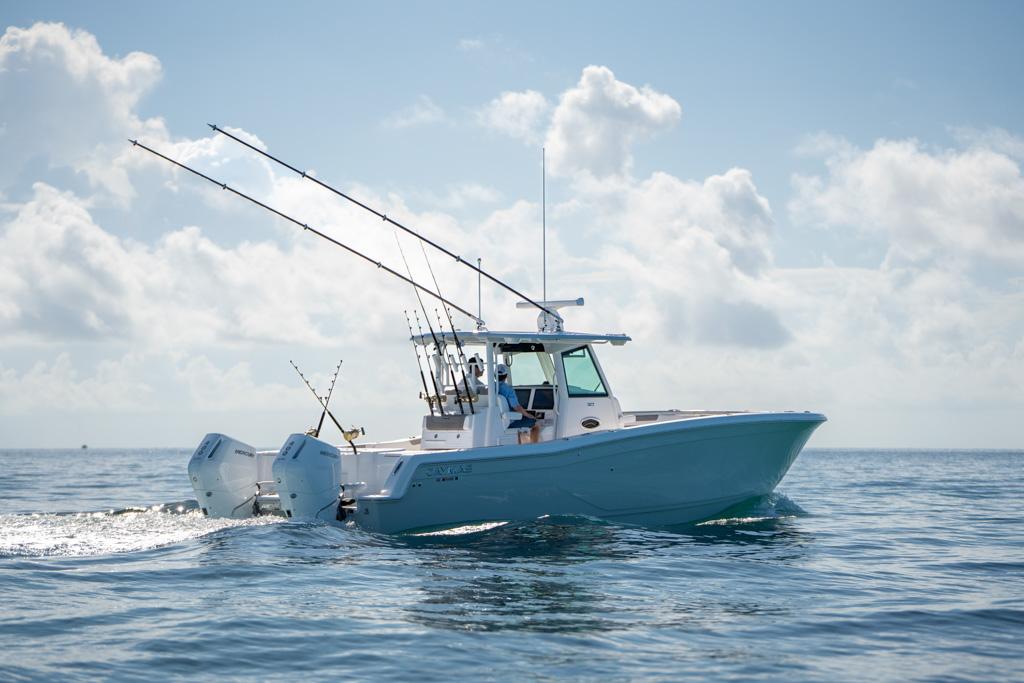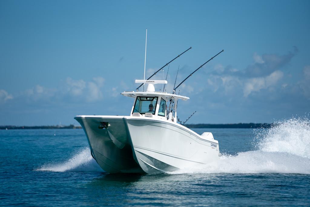 The 34 CT features chaise lounge seating, a marine head with holding tank, and fold down bow seating that conceals within the gunnel, allowing anglers to move from stern to bow unobstructed across the flat deck and it’s 10’ 10” beam.