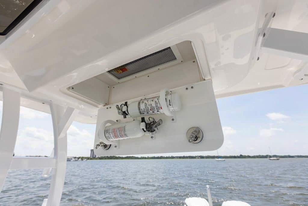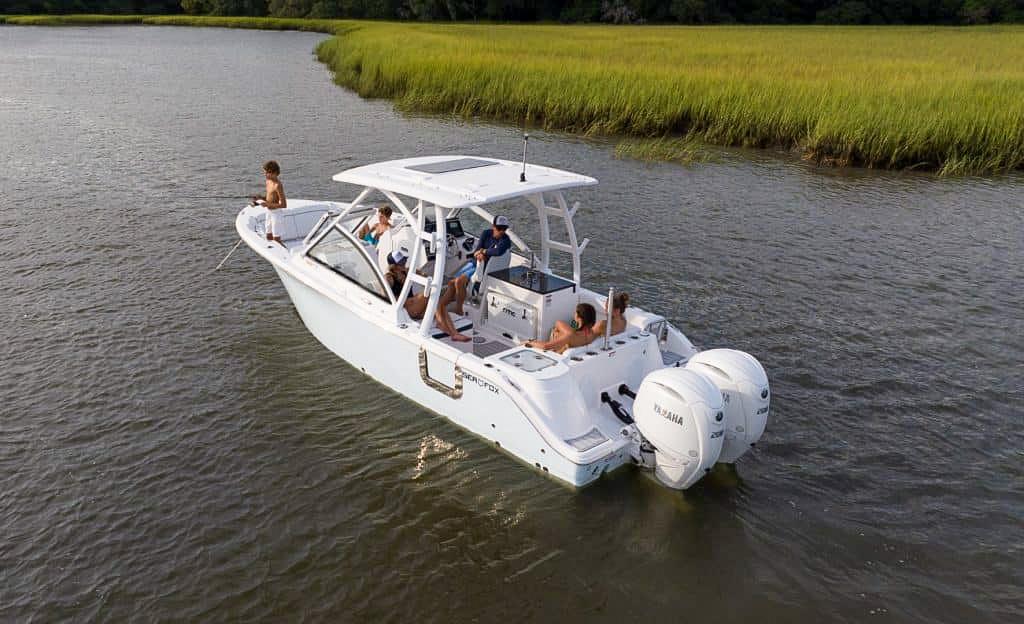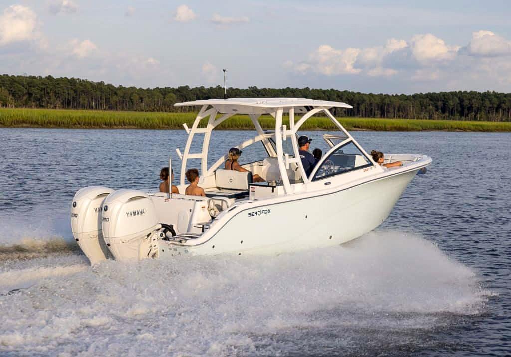 The Sea Fox 268 Traveler is powered by twin Yamaha 200’s which deliver a fast and smooth performance across various water conditions. The boat also features a sleek and sturdy design, with a hard top, white powder coating, and LED tech package. The hard top also provides shade and protection from the sun, as well as a platform for additional accessories such as rod holders and electronics.